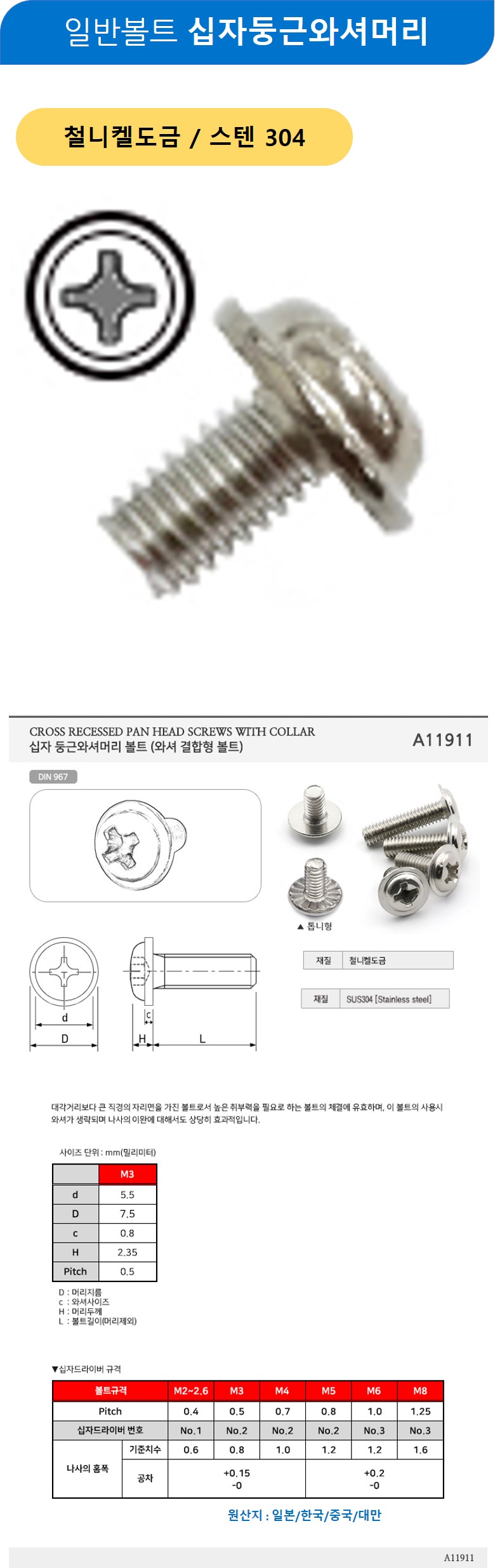 일반볼트 십자둥근와셔 스텐 M2.5x3mm 500개
