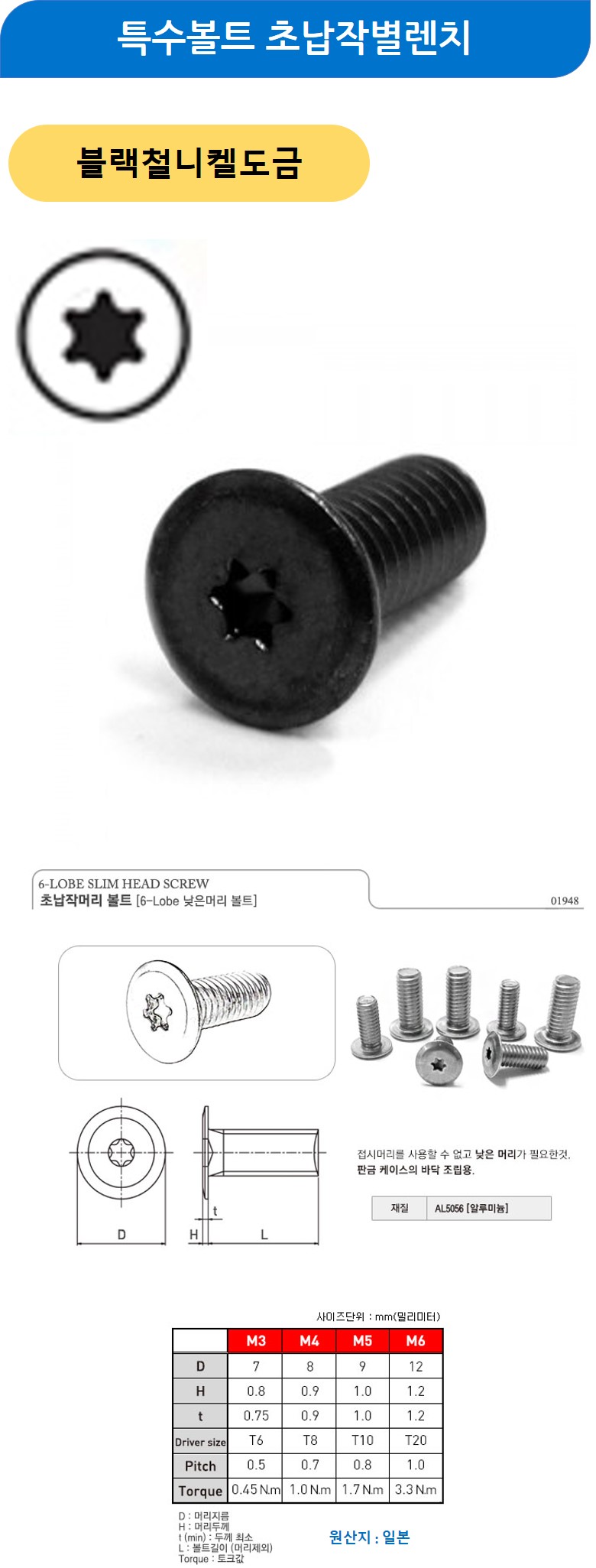 특수볼트 초납작별렌치 블랙철니켈도금 M5x8mm 200개