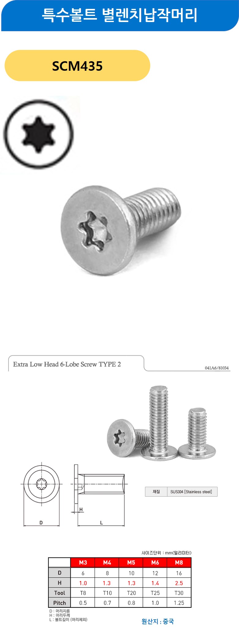 특수볼트 별렌지납작머리 스텐 M5x10mm 200개