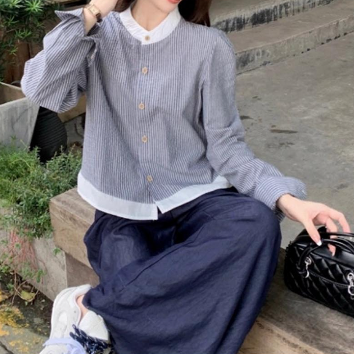 차이나카라 블라우스 세련되고 모던한 세로줄 셔츠