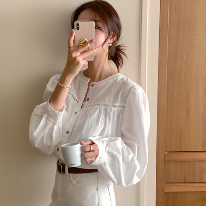 긴팔 블라우스 펀칭 셔츠 퍼프소매 노카라 디자인