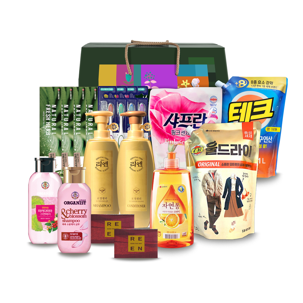 · 리엔 로열젤리 샴푸 400ml 1개 · 리엔 로열젤리 컨디셔너 400ml 1개 · 리엔 클렌징바 비누 80g 2개 · 샤프란 핑크센세이션 섬유유연제 1000ml 1개 · 오가니스트 체리블라섬 샴푸 200ml 1개 · 오가니스트 바디워시 190ml 1개 · 자연퐁 용기 솔잎 490ml 1개 · 죽염 네추럴프레쉬허브 치약 130g 4개 · 테크 울드라이 세제 1300ml 1개 · 테크 베이킹소다구연산 세제 1000ml 1개 · 페리오 칫솔 4개 |