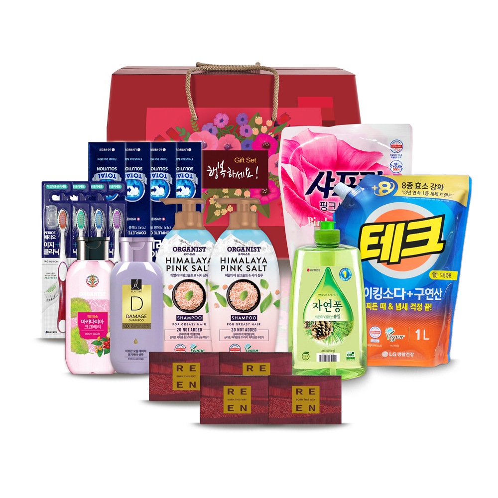 · 리엔 클렌징바 비누 80g 4개 · 샤프란 핑크센세이션 섬유유연제 1000ml 1개 · 엘라스틴 샴푸 200ml 1개 · 오가니스트 핑크솔트 샴푸 380ml 2개 · 오가니스트 바디워시 190ml 1개 · 자연퐁 솔잎 세제(용기) 490ml 1개 · 테크 베이킹소다구연산 세제 1000ml 1개 · 페리오 캐비티케어 치약 90g 4개 · 페리오 칫솔 4개 |