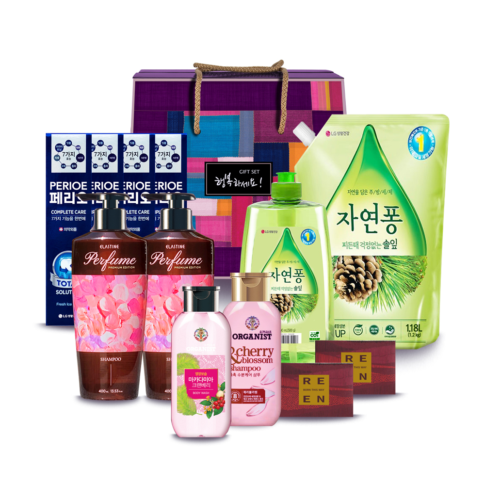| · 리엔 클렌징바 비누 80g 2개 · 엘라스틴 데일리리페어퍼퓸 샴푸 400ml 2개 · 오가니스트 체리블라섬 샴푸 200ml 1개 · 오가니스트 바디워시 190ml 1개 · 자연퐁 솔잎 리필 1180ml 1개 · 자연퐁 솔잎 세제(용기) 490ml 1개 · 페리오 캐비티케어 치약 90g 4개 |