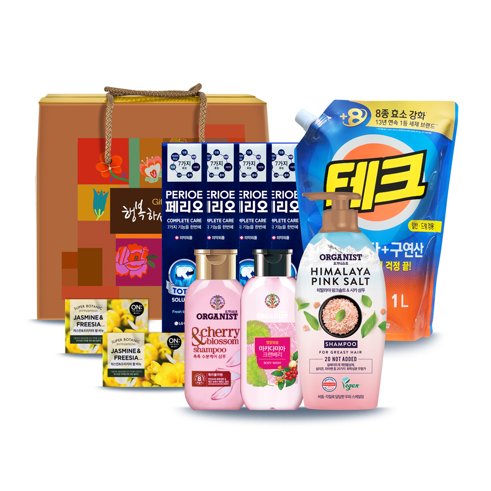 · 오가니스트 핑크솔트 샴푸 380ml 1개 · 오가니스트 체리블라섬 샴푸 200ml 1개 · 오가니스트 바디워시 190ml 1개 · 온더바디 보타닉 비누 80g 2개 · 테크 베이킹소다구연산 세제 1000ml 1개 · 페리오 캐비티케어 치약 90g 4개 |